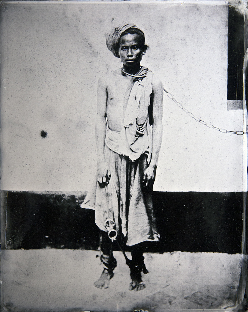 Arrested for insurrection for defending their homeland, chained in pairs, the beaten men stare back unflinching at their oppressor’s camera lens, elevating these mug-shots of political prisoners from 1902 into something noble and impossible to ignore. Surely a totem image for our time, thought photo-artist Manit Sriwanichpoom when he discovered these enigmatic black and white portraits one day at the National Archive. By reproducing the images through an old photographic process from 1851, of wet-collodion on 8” x 10” black glass plates, Manit took the digital files of these Ngiow (Tai Yai) warriors back to their time, allowing us to view the men with a sense of awe and respect. They do not appear like terrorist killers of Siamese soldiers and bureaucrats who had come to take away their power and their rights. Driven to help them tell their untold story and their reasons for resisting Siamese hegemony, Manit was inspired to create an installation of the men as skeletons in the cupboard of Siamese history.