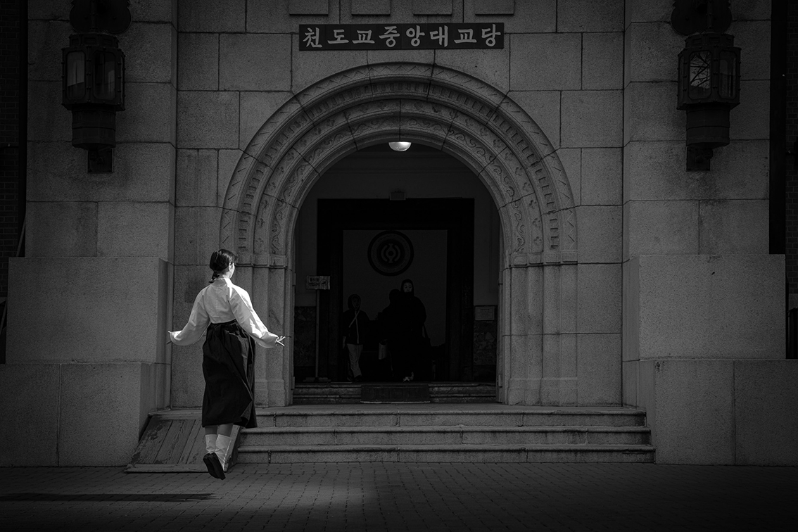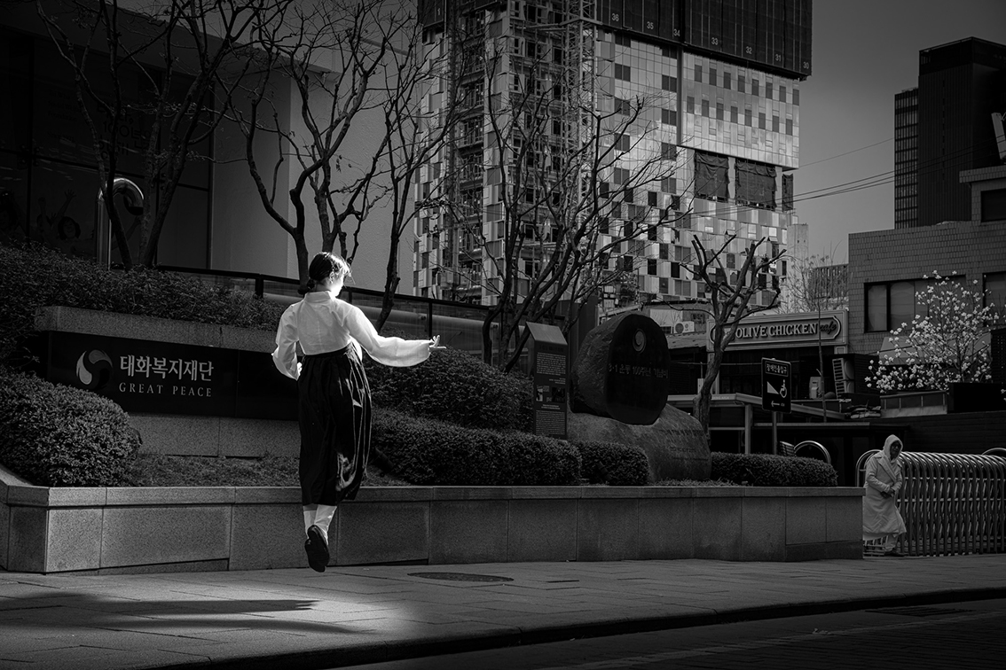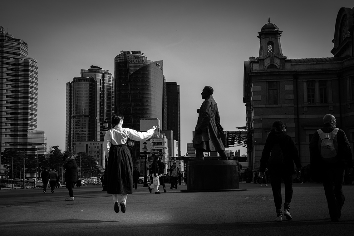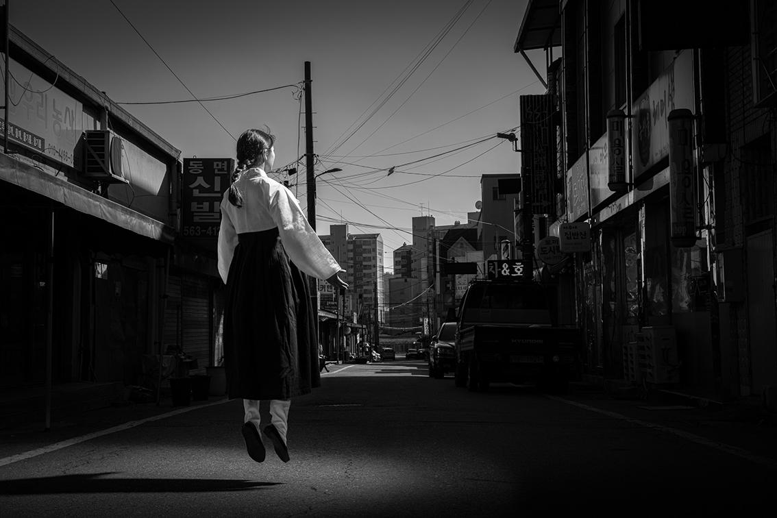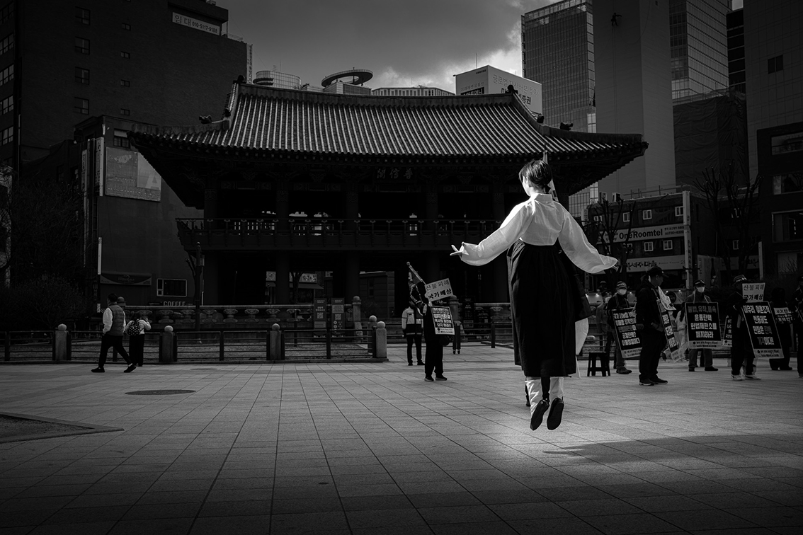 This series of calm, black-and-white photographs features a young girl who might be the spirit of Yu Gwan-sun, a symbol of sacrifice for Korean independence. She appears in front of various landmarks dedicated to freedom and democracy. Her presence seems to ask questions about the current state of rights, independence, and democracy in South Korea today.